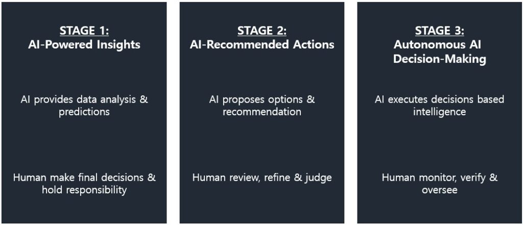 At this stage, the role of humans shifts from decision execution to oversight, exception handling, and continuous improvement. AI becomes an operational decision engine, while people remain accountable for strategy, governance, and long-term direction.